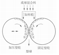 對輥壓球機(jī)是發(fā)展較早、應(yīng)用多的壓團(tuán)法設(shè)備,因其對原料粒度要求低、成球質(zhì)量高、可用有機(jī)粘結(jié)劑,且有機(jī)粘結(jié)劑在燃燒過程中可以提供部分熱量, 燃燒產(chǎn)物少,不會影響到直接還原后產(chǎn)品品質(zhì),對輥壓球機(jī)是轉(zhuǎn)底爐工藝中普遍應(yīng)用的原料成球設(shè)備。