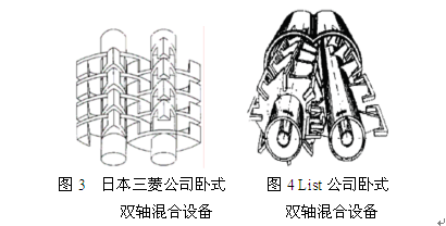 如圖3所示為某日本公司生產(chǎn)的臥式雙軸攪拌器,攪拌構(gòu)件為橢圓盤狀,兩攪拌軸由調(diào)速馬達(dá)驅(qū)動(dòng)作同向旋轉(zhuǎn)運(yùn)動(dòng),槳葉表面、槳葉端部與器壁之間及槳葉端部與攪拌軸之間間隙較小,使得攪拌器具有自清潔作用。圖4所示為瑞士某公司生產(chǎn)的臥式雙軸攪機(jī),兩根軸中的一根為主攪拌軸,上面有許多被捏合桿連在一起的盤片,捏合桿略有傾斜,使物料在進(jìn)行徑向混合的同時(shí)能受到一個(gè)軸向的輸送力;另一根是清潔軸,該軸裝有一排傾斜的捏合框。清潔軸以3倍于主攪拌軸的轉(zhuǎn)速進(jìn)行旋轉(zhuǎn),通過兩軸上的元件相互嚙合,從而使攪拌器具有自清潔功能。
